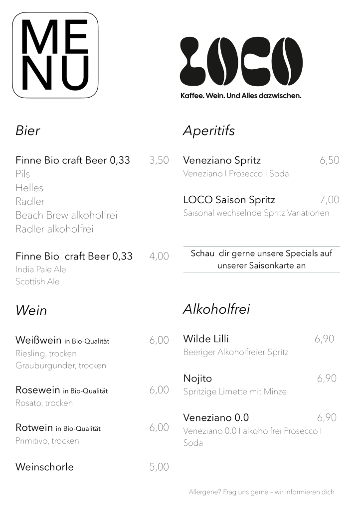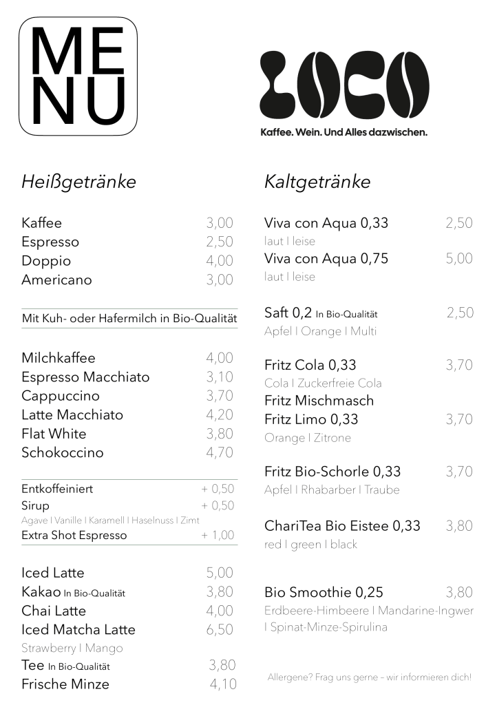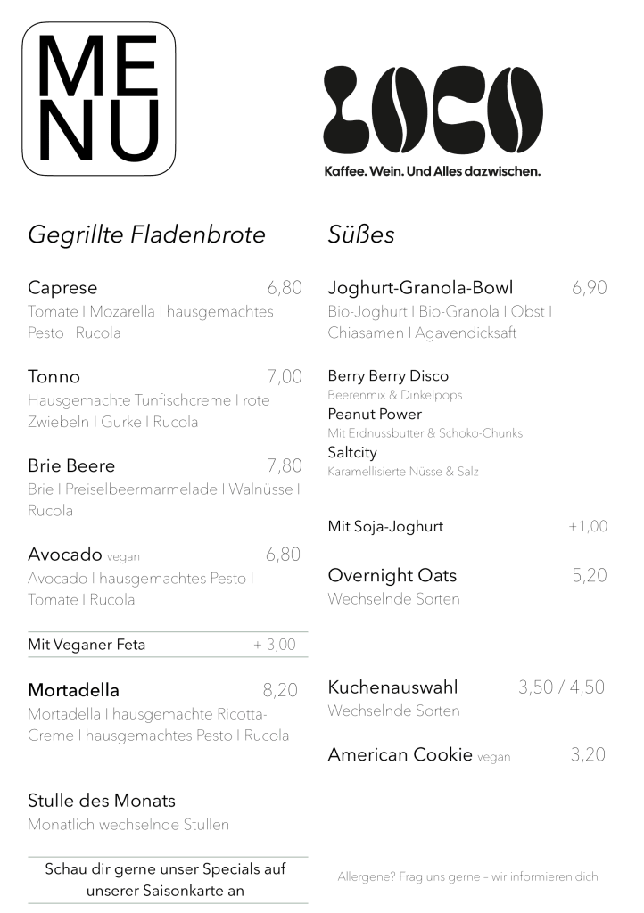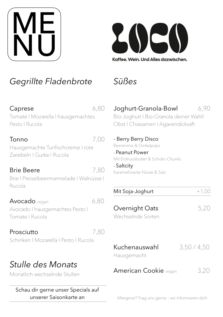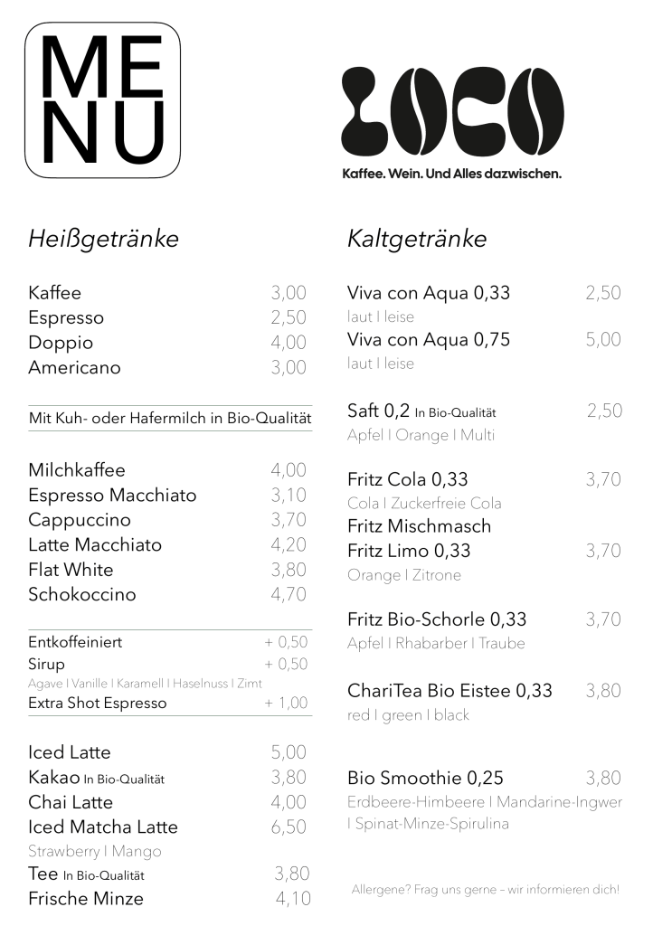 Mit LOCO möchten wir einen Platz gestalten, an dem Du dich Zuhause fühlst: ein gemütliches Café, das keine Wünsche offenlässt, kombiniert mit einem gut sortierten Bioladen, in dem wir Dir mit viel Sorgfalt ausgesuchte Produkte anbieten. Besonders am Herzen liegt uns unser Unverpackt-Bereich – ein kleiner Schritt in Richtung Nachhaltigkeit, den wir gerne gemeinsam mit Dir gehen.
